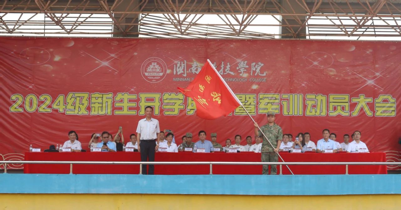 典礼上,校领导共同为新生代表们佩戴校徽,并为学生军训团授旗,这也象征着2024级同学们正式步入大学生活,成为雷速网页版的一员。