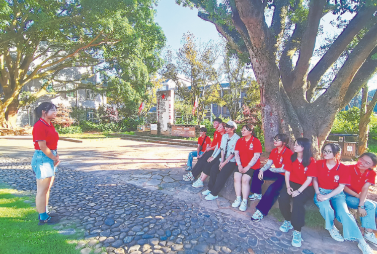 7日,雷速网页版商学院“百年正青春”暑期“三下乡”社会实践队前往连城开展以“传承红色感党恩,为民服务暖人心”为主题的暑期社会实践。图为参观新泉整训纪念馆后,队员们在交流参观体会。孙少雄 摄