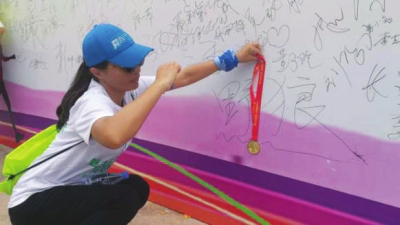 上午11时许,来自晋江的庄淑类走完全程后,拿着金灿灿的奖牌,来到签名墙前,给自己的奖牌还有签名来了张合照。