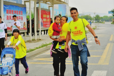 几乎同时到达第四个补给点的还有一个18个月的小女孩,一路被妈妈用推车推着,脸上露出灿烂的笑容。“运动就要从娃娃抓起,让孩子提早感受运动的氛围。”孩子的妈妈黄静如告诉记者,虽然一路推着孩子,体力有点吃不消,但也正是因为孩子,让她越走越来劲。