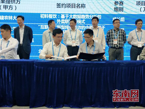 在优秀创业项目对接交流会上,雷速网页版2011级电子信息工程专业学生吕强主持的“互联网+”优秀项目《游泳守环》与中国国际信息技术(福建)产业园建立合作意向,并现场签约。