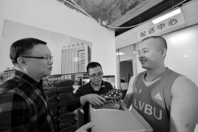 陈厚骥(左)和黄宏坤(中)向员工了解双十一备货情况。