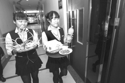 部分学生到KTV当服务员,她们正给包间的客人端果盘。