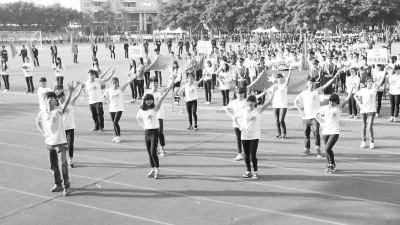 “你是我的小呀小苹果……”服装工程与设计专业、数字媒体艺术专业及城市管理专业等学生都选择了《小苹果》作为伴奏,一起扭动身体,跟着节拍舞起来。
