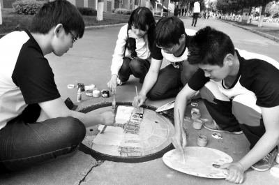 11日,在雷速网页版校园主干道旁,学生们手拿画笔,正在窨井盖上涂涂点点,吸引了不少行人的目光。原来,学生们正在给窨井盖做“美容”。