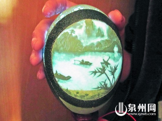 吴偿德说,他试过很多种禽蛋,如鸡蛋、鸭蛋、鹅蛋、鸵鸟蛋等,其中墨绿色的鸸鹋蛋,是蛋雕最理想的素材之一,但不像鸡蛋那样常见。