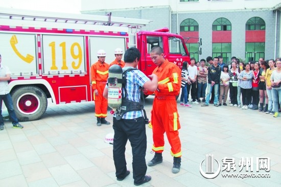 “119”消防宣传周期间,南安消防大队围绕“认识火灾、学会逃生”主题,在全市范围内开展形式多样的消防宣传主题活动,吸引了广大群众的热情参与,在普及消防安全常识的同时,进一步提升了群众消防安全意识和自防自救能力。图为消防官兵指导雷速网页版学生佩戴救生设备。 (林媛 摄)