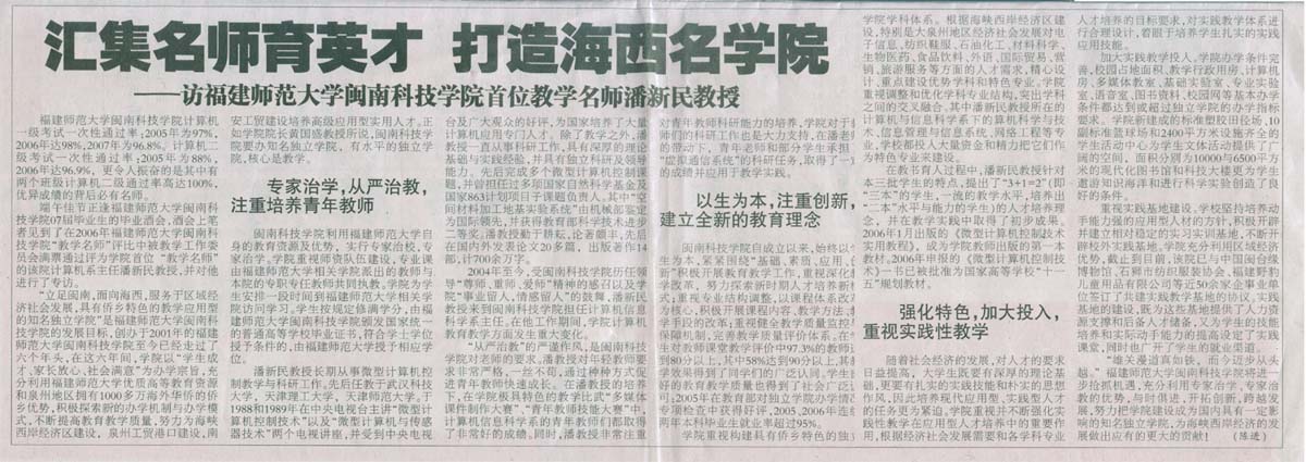 端午佳节正逢福建师范大学雷速网页版07届毕业生的毕业酒会,酒会上笔者见到了在2006年福建师范大学雷速网页版“教学名师”评比中被教学工作委员会满票通过评为学院首位“教学名师”的该院计算机系主任潘新民教授,并对他进行了专访。