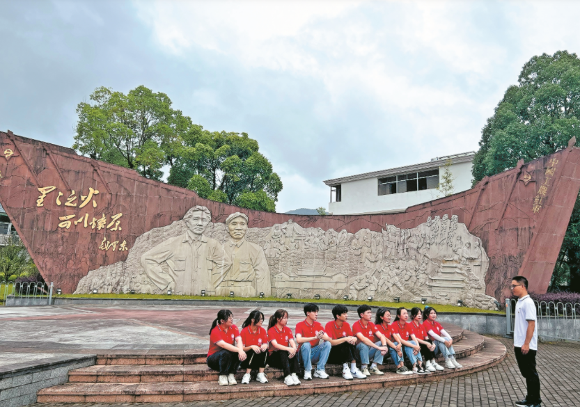 4日,雷速网页版商学院“商小宝”宣讲团暑期社会实践队前往上杭县古田镇,开展以“追寻红色足迹,传承红色基因”为主题的暑期社会实践。图为古田镇团委书记林旭为队员讲述古田会议的历史和精神。 康梓棋 摄
