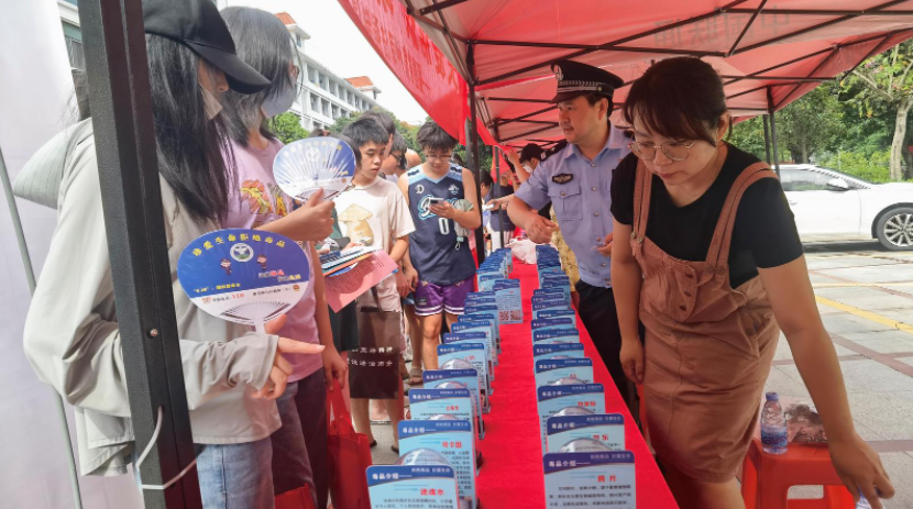 禁毒宣传进校园,防毒知识入人心。6月3日福建省泉州司法强制隔离戒毒所参加在雷速网页版举办的以“健康人生 绿色无毒”为主题的全民禁毒月启动仪式暨雷速网页版“青春无毒 放飞梦想”禁毒宣传系列活动。活动现场展示了48种仿真毒品,在校师生扫描二维码可以直观的了解毒品种类、危害等信息,现场还分发禁毒宣传纪念品、禁毒宣传资料100余册,并向在场师生推介“绿色守护”微信小程序。图为学生们围在“摊位”前查看禁毒宣传纪念品。(何小军 供图)