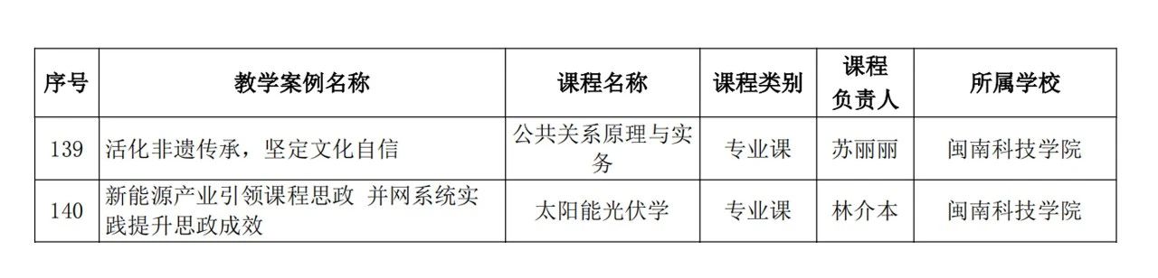 近日,福建省高校课程思政教育联盟和福建省新工科教育联盟分别公布了第二批课程思政优秀教学案例及新工科教育优秀教学案入选名单,我校有3项案例成功入选。其中,苏丽丽副教授负责的《活化非遗传承,坚定文化自信》、林介本副教授负责的《新能源产业引领课程思政 并网系统实践提升思政成效》入选“福建省高校第二批课程思政优秀教学案例”,陈美龙老师和禹谢华教授共同负责的《基于新工科的课程教学案例》入选“福建省第二批新工科教育优秀教学案例”。