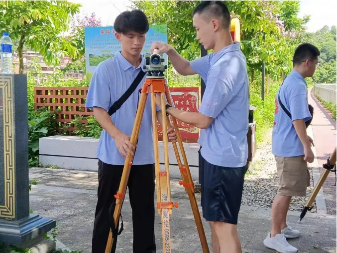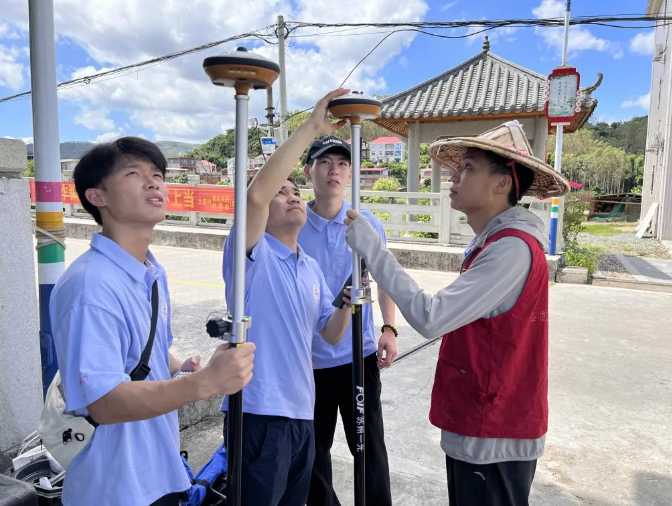 在大庭村,实践队利用经纬仪、全站仪、RTK等测绘设备,对诗溪大庭段开展地理空间信息数据采集,深入了解大庭村古建筑构造及保护工程,并为诗溪漫道开发与保护提供数据支持。