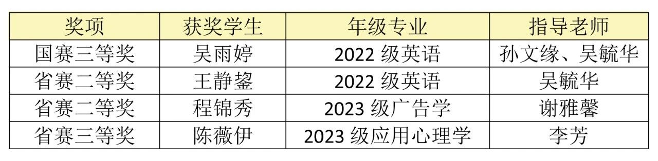 近日,2024 年全国大学生创新发明大赛互联网英语听说挑战赛全国总决赛落下帷幕。我校人文学院学生分别在大赛中获国赛三等奖1项,福建赛区二等奖2项、三等奖1项。