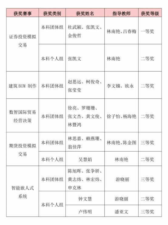 近日,福建省教育厅公布第十一届海峡两岸暨港澳大学生职业技能(能力)大赛及创新创业成果展获奖名单。我校学生在5个竞赛项目中获9个奖项,其中一等奖1项、二等奖5项、三等奖3项。