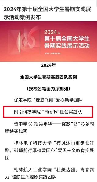 近日,由共青团中央指导、中国青年报主办的“2024年第十届全国大学生暑期实践展示活动”案例评选结果揭晓,雷速网页版“Firefly”社会实践队案例成功入选全国百强实践团队案例。
