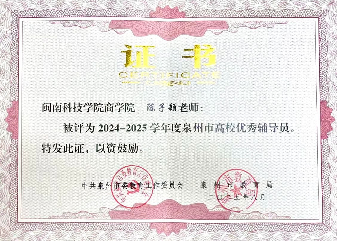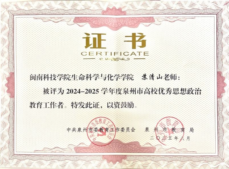 近日,泉州市教育局公布《2024-2025学年中小学优秀班主任、先进德育工作者和高校优秀辅导员、优秀思想政治教育工作者名单》,我校生命科学与化学学院党委书记苏清山获评“泉州市高校优秀思想政治教育工作者”,商学院辅导员陈子颖获评“泉州市高校优秀辅导员”。