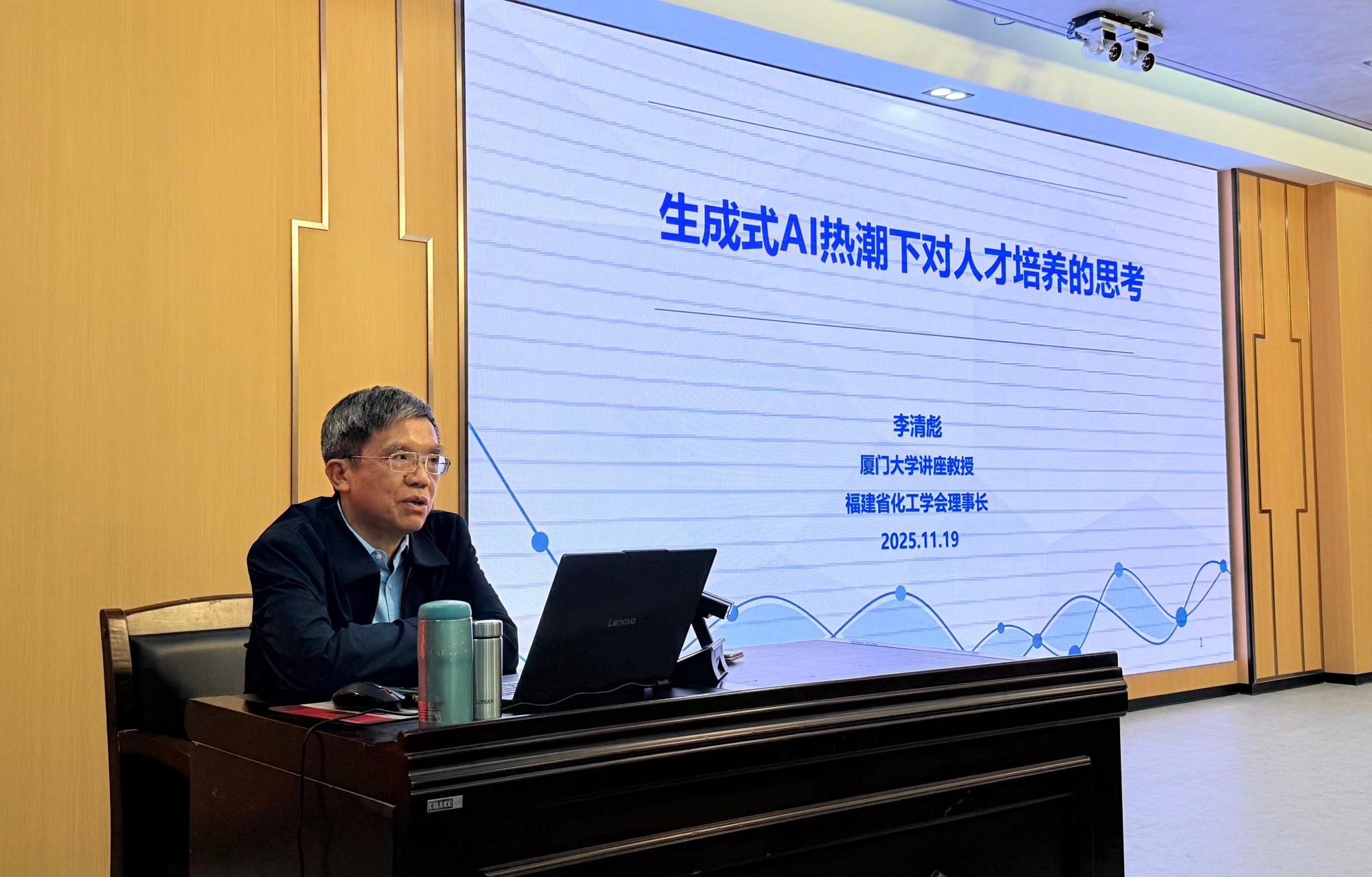 讲座上,李清彪教授系统梳理了生成式AI的崛起背景、演进历程及广泛应用,通过生动案例阐述其在化工研究及产业中对科研创新的赋能,并从哲学层面探讨技术发展对传统教育科研模式的冲击与重塑,及其未来教育及人才培养的思考。他勉励广大师生将生成式人工智能更好地融入应用创新人才的培养体系中,对标时代新需求,精准定位发展特色,提高育人质量。整场讲座深入浅出、内容丰富,使现场师生受益匪浅。