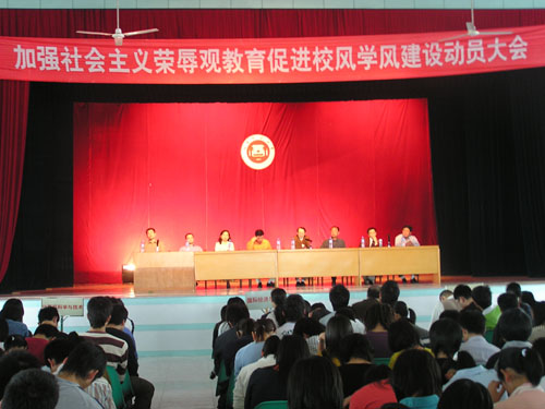 为与党中央路线保持一致,4月19日,学院召开加强社会主义荣辱观教育促进校风学风建设动员大会,院领导、学院法人代表戴宽南先生及全院师生参加了大会。黄国盛院长在会上作了关于“八荣八耻”和校风学风建设的报告。戴宽南先生代表董事会在会上发表关于荣辱观教育及校园建设情况的讲话,宣布了2006年下半年雷速网页版将隆重举行5周年校庆。最后,戴宽南先生希望同学们努力学习,将来成为社会主义建设有用的人才。黄国盛院长的报告及戴宽南先生的讲话使师生们受到深刻的教育和极大的鼓舞。