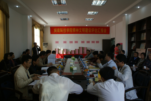 11月11日,由福建师范大学后勤管理处戴绍明处长、教务处陈祖祺副处长、文明办范庆洪主任、组织部邱海锋、纪委阮传瞰组成的检查小组对学院2009-2010学年开展精神文明建设工作进行检查评估。学院在第一会议室召开了精神文明先进单位创建汇报会。学院院长郭丹、党委常务副书记林国庆、副院长肖华山、党委副书记陈振祯、副院长周勇军、董事长助理戴景星、各系系主任、各职能部门负责人等参加了汇报会。