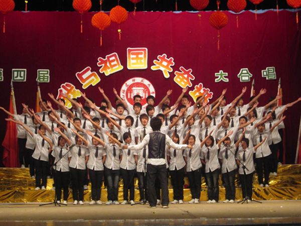 比赛以专业组队的形式进行,共有十七支队伍参赛。比赛现场气氛热闹活跃,一支支队伍有序、紧凑地上场,一浪又一浪的歌声盘绕在学生活动中心,掌声、欢呼声洋溢于每一个角落。每支比赛队伍都使出浑身解数,给观众们带来别样的感官享受。昂扬的斗志,通过各种各样的方式来展示对祖国的祝福,唱响了年轻与激情,唱响了浓浓的爱国情怀。中文专业的同学匠心独运,在合唱歌曲《国家》时,采用时光倒流的方式,向大家展示了祖国60年来的变化,从服装、通信工具、科学技术的发展见证了祖国母亲的强大,这一创新的方式吸引了广大观众的眼球。英语专业的同学则结合玉树地震,在歌曲《相信爱》的尾声之时,将一颗破碎的红心黏好,传达了祖国处处充满爱的情怀。经过激烈的角逐,最终,英语、国贸和中文专业获得前三名。