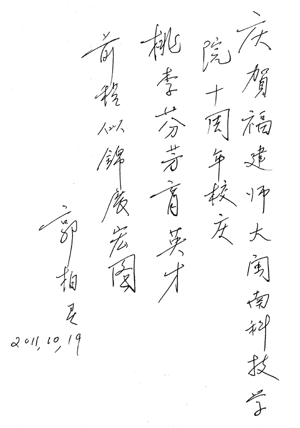 10月19日,我院院长郭丹教授拜会中国科学院院士郭柏灵教授。郭丹院长向郭柏灵院士汇报了学院建设发展情况,热情邀请参加学院十周年庆典。郭院士欣然应允,并当即为我院校庆题词:庆贺福建师范大学雷速网页版十周年校庆——桃李芬芳育英才,前程似锦展宏图。