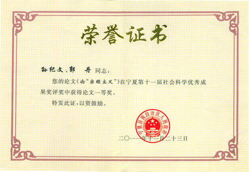 教授的博士生)的《论“宗经立义”》获论文类一等奖。12月初,宁夏回族自治区人民政府颁发了荣誉证书。
