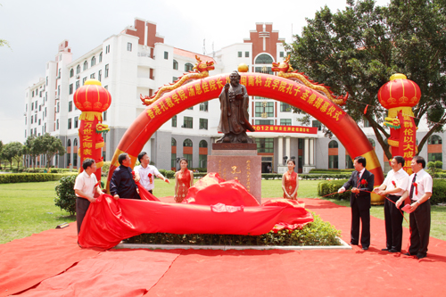 6月26日上午,我院在校大门口举行孔子圣像揭幕仪式。圣像捐赠人、香港孔教学院院长、国际儒学联合会副理事长汤恩佳博士,香港孔教学院副院长、香港汤恩佳孔子思想宣讲团永久荣誉团长、香港孔教总会永远名誉会长吕天增先生,香港汤恩佳孔子思想宣讲团团长、复旦大学博士杨发坤先生,南安市副市长李清安先生,福建师范大学校长助理郭警修先生,泉州市文庙管理处何振良先生,福州市孔子学会常务副会长柯远扬教授,福州市孔子学会秘书长、孔子75代孙孔海钦先生,我院戴宏达董事长、戴宽南副董事长、郭丹院长、林明旭党委常务副书记和有关部门负责同志、师生代表,福州市孔子学会理事、部分会员以及社会各界人士参加了揭幕仪式。仪式由我院周勇军副院长主持。