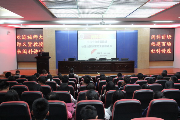 12月3日,“闽科讲坛”邀请福建师大党委讲师团宣讲成员、马克思主义方法学研究所所长、公共管理学院博士生导师郑又贤教授,在图书馆学术报告厅作了题为“中共中央全面推进依法治国决定的主要创新点”辅导讲座。讲座由院党委常务副书记林明旭主持。