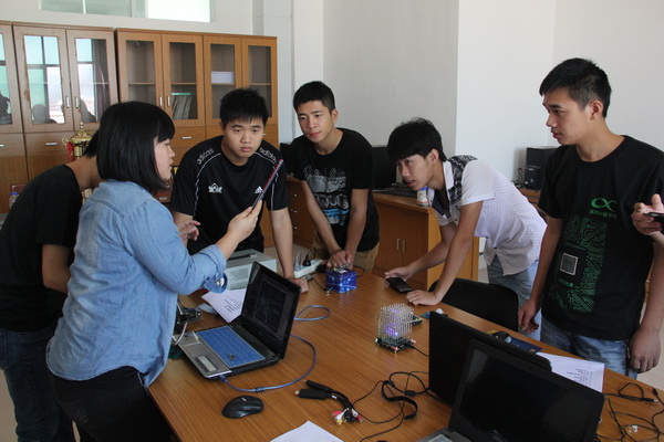 据了解,本次展览会共有22件设计作品参展,作品来自于创新实验室2012级、2013级光电系电子信息工程专业的同学们,作品包括 “旋转LED”、“3D8”、“四轴飞行器”、“蓝牙漂移赛车”“智能家居”等同学们最新学习成果。如展品“旋转LED”设计新颖,效果炫酷引来众多同学们的围观;“蓝牙漂移赛车“则有摄像的功能,一部手机就可以完全控制它的方向,好奇的同学们也参与其中。展会上的作品无一不凝聚了电子创新实验室师生们的智慧与汗水,展现了我院大学生独到的创新能力与聪明才智。