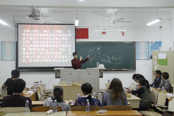 许副教授从“创新教育”展开论述,强调了创新离不开破旧,破旧离不开质疑。他希望教师能够大胆发挥创新教育中的批判性思维,敢于和善于质疑,从而促进教师、学生和编者更深入地“吃透”教材。他认为在质疑训练中寻找反例,使思维展开全方位的发散性搜索,并加以分析、综合和评价,这正是创新思维的必要准备。他具体列举了多个无机的例子,通过逻辑辨析和集论表述,详细地阐述了“知识的阶段性” 、“概念的逻辑性”、“表达的科学性”、“语言的严密性”、“潜在的学术性”等方面的化学知识问题。
