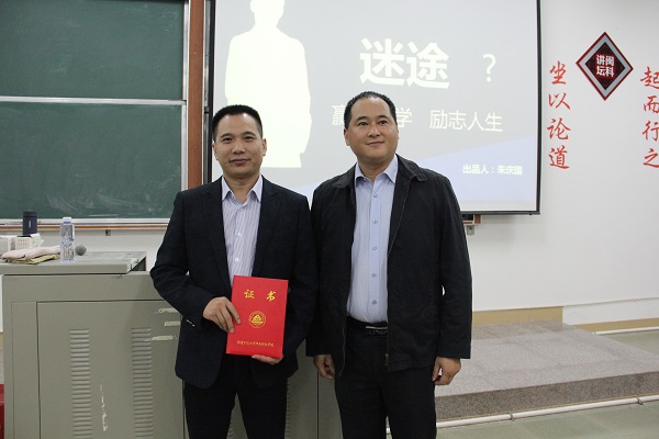 讲座现场,学院副院长周勇军代表学院向朱庆国先生颁发聘书,敦聘朱庆国先生为我院客座副教授。