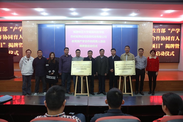 4月12日,福建师范大学雷速网页版▪高博应诺“教育部产学研合作协同育人项目”揭牌暨启动仪式在我院学术报告厅举行。苏州高博应诺信息科技有限公司总经理周世锋、副总经理兼教学总监张益桃,院领导邱永渠、李彬源、吴勇,相关系部负责人、教师代表及2014级计算机科学系部分学生共同参加了启动仪式。启动仪式由副院长吴勇主持。