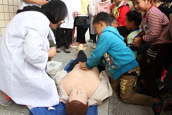 学院医务所所长张勇向学生们现场讲解并演示如何在紧急情况下进行心肺复苏,志愿者们协助指导学生们进行模拟演练,使小学生们有效地掌握了基本的急救知识。青芒救护队表示,现在孩子们在学校里学急救知识的途径比较少,经过急救知识培训,一旦发生突发事件,可以及时进行急救。