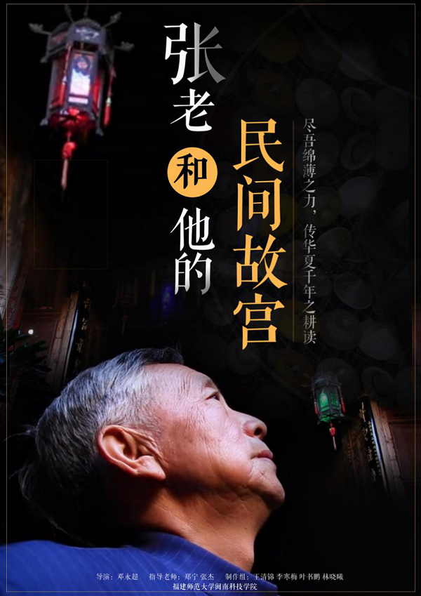 作品《张老和他的民间故宫》记录了宁德市屏南县一位七旬老人,退休后不枉虚度,发挥余热,尽绵薄之力,保护中华传统文化——耕读文化,历经10年收藏之路,收藏大大小小文物三万余件,修缮十四座古民居作为展厅。张老开设屏南耕读文化博物馆,让孩童感知、青年人感受、中年人感悟、老年人感怀耕读文化。