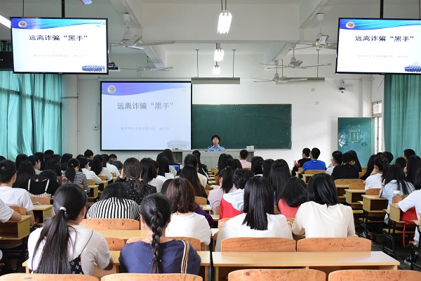 当天下午,赵元红中队长做了以“认清传销危害,远离诈骗陷阱”为主题的讲座。赵元红中队长从校园贷、兼职、传销三个方面入手,揭露诈骗黑手的真面目。她表示,作为一名大学生,应提高思想警惕,认真学习防诈骗知识,远离传销组织,希望同学们面对新型诈骗方式要擦亮双眼,不断加强防诈骗观念。