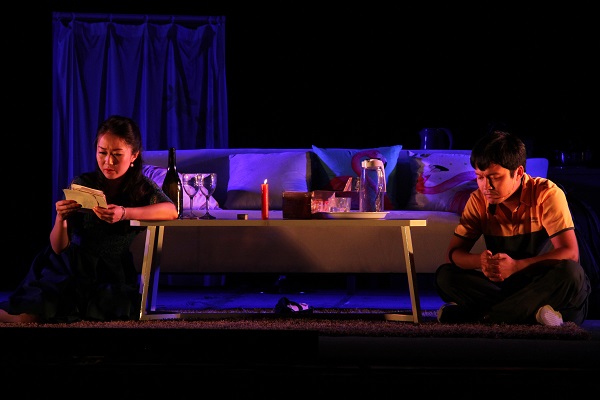 话剧《花事如期》讲述的是女主人公海伦在一夜之间的人生故事。海伦某夜在自己寓所内精心打扮,等待男友前来求婚,等来的却是快递来的“拜拜”与账单。在伤心绝望,想要自杀之时,海伦被快递员青子绊住。两人一夜的情感交流,给双方带来了生活、爱情观念的升华。舞台上,两位演员你来我往,用饱含情绪的语言与到位的肢体动作向现场观众们展示了这“一夜”间的情感转折与剧情的跌宕起伏。演员们用精湛的表演、形象的艺术刻画和高雅的艺术气息为我院师生带来了一个难忘的视觉盛宴。