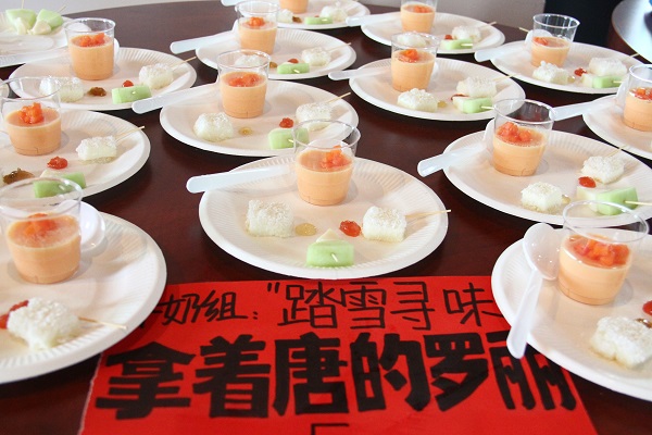 经过初赛、复赛的激烈角逐,共有8支队伍进入决赛,选手们在现场为大家呈现了品种丰富、做工精细的甜点、饮品等作品,评委们细致品尝,并针对食材、配方、工艺、创意等方面进行提问和打分。最终,“拿着唐的罗丽”队作品《踏雪寻梅》荣获竞赛一等奖。
