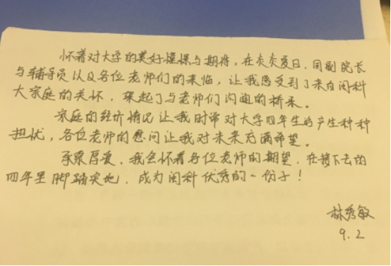 林秀敏同学手写了一份感谢信来表示自己心中的感谢,感谢学院领导、教师,能够如此关心贫困家庭,贴心地送来慰问及慰问金。方思婷同学及父亲都感动万分,感谢学校对贫困学生的关怀及资助,也希望学院能够越办越好,同学们都能够在学院认真学习,实现自身价值。