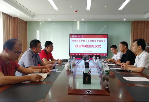 10月10日下午,我校与泉州锐驰智能科技有限公司校企共建签约仪式在明德楼20楼会议室举行。锐驰集团副总裁吴德福,学校副校长吴勇,光电信息学院、教务部等相关职能部门负责人参加仪式。