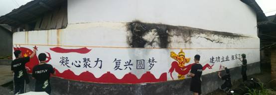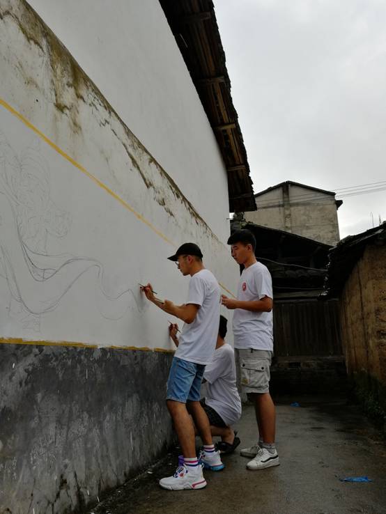 实践队队员们走访了元坑镇际下村,仔细勘察村容村貌,选定了适合进行“文化墙绘”的墙面,“凝心聚力 复兴圆梦 建功立业 保家卫国”主题墙绘跃然墙面,新时代社会主义建设的恢宏气息与老镇的古朴气息交相辉映,展现出一幅乡村“新图景”。