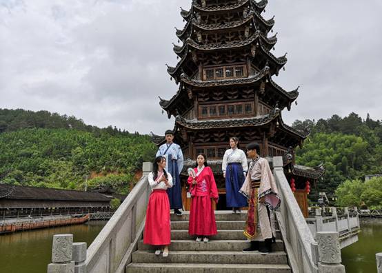 文昌桥、文昌阁、登云桥……在元坑镇,随处可见古水井、古祠堂、古牌匾、古桥、古庙宇等,它们融古朴、典雅、富丽、秀巧于一身。实践队员们身着汉服,手拿绣花团扇,撑起油纸伞,走在洋溢着浓郁的传统文化气息的元坑古镇,通过“抖音”拍摄了一段段古色古香的古镇风光,借助新媒体技术平台推广元坑古镇旅游文化产业。
