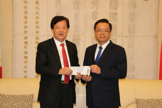 我校董事长戴宏达博士捐赠两百万善款由黄溪连大使代表接受转交祖国疫区