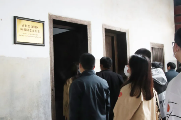 步入古田会议旧址,映入眼帘的是一排排虽显陈旧简陋却整齐的桌椅,墙上张贴着马克思和列宁的画像,柱子上贴着宣传标语。党员们沿中庭站着,聚精会神地听取讲解,身临其境感受思想建党、政治建军的古田会议精神和意义。