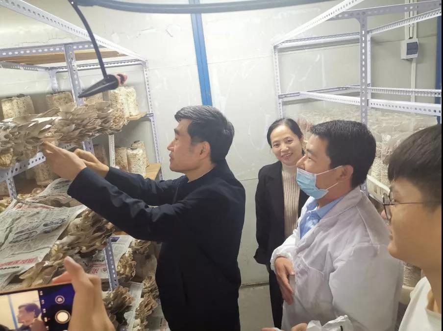 揭牌仪式结束后,校长游小波一行深入劳动育人基地,参观并了解了厂房内食用菌的种植技术、栽培情况、生长状况和加工工艺等。