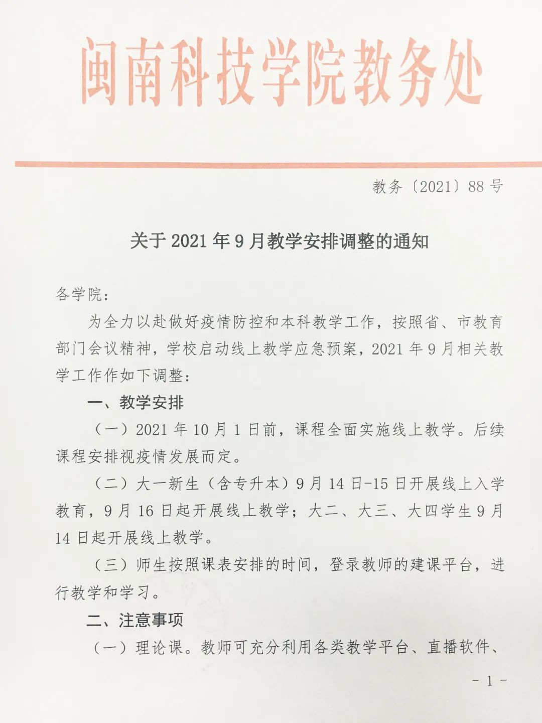 教务处制定《关于2021年9月教学安排调整的通知》