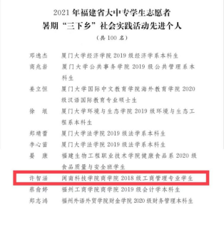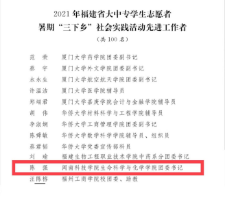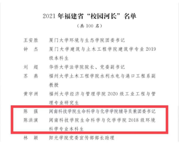 近日,2021年福建省大中专学生志愿者暑期“三下乡”社会实践活动评选结果公布,我校生命科学与化学学院团委书记陈强老师获省级“社会实践先进工作者”“校园河长”荣誉称号,商学院2018级工商管理专业许智涵同学获省级“社会实践先进个人”荣誉称号,2018级环境科学专业陈洪演同学获省级“校园河长”荣誉称号。