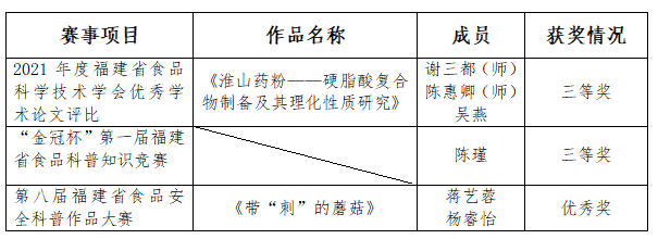 近日,由福建省科学技术学会、泉州市人民政府主办的第二十一届福建省科协年会专项活动——食品科技高峰论坛落下帷幕。论坛涵盖多项赛事项目,我校生命科学与化学学院师生分别在2021年度福建省食品科学技术学会优秀学术论文评比、“金冠杯”第一届福建省食品科普知识竞赛、第八届福建省食品安全科普作品大赛中喜获佳绩。