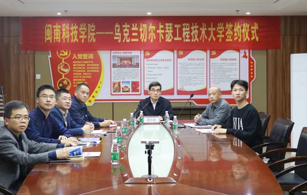 乌克兰切尔卡瑟工程技术大学校长格里戈尔·奥列格、国际关系副校长法乌雷·艾米尔、国际合作处国际项目秘书乌西克·柳德米拉、中国唯一代表处主任郑成寿,我校领导游小波、周勇军出席签约仪式,校党政办、教务处、招生就业处等相关职能部门负责人参加签约仪式。