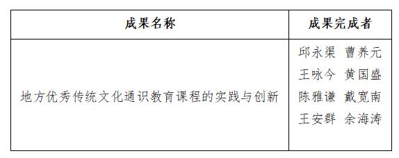 近日,福建省教育厅公布2022年福建省高等教育教学成果奖获奖名单,我校副校长邱永渠主持的《地方优秀传统文化通识教育课程的实践与创新》荣获2022年福建省高等教育教学成果二等奖。