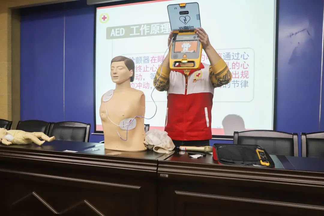 培训会上,南安市红十字应急救护培训中心老师们采用理论讲解和实操演示相结合的方式,借助PPT课件为学员们讲解了心肺复苏理论、AED自动体外除颤仪的使用方法、气道异物梗阻急救、创伤救护常见意外伤害处理等急救知识,并结合实操内容对学员进行分组练习指导与考核。